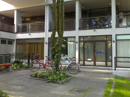 The entrance to Innovatics is in the right hand end of the yard, on top of the steps.